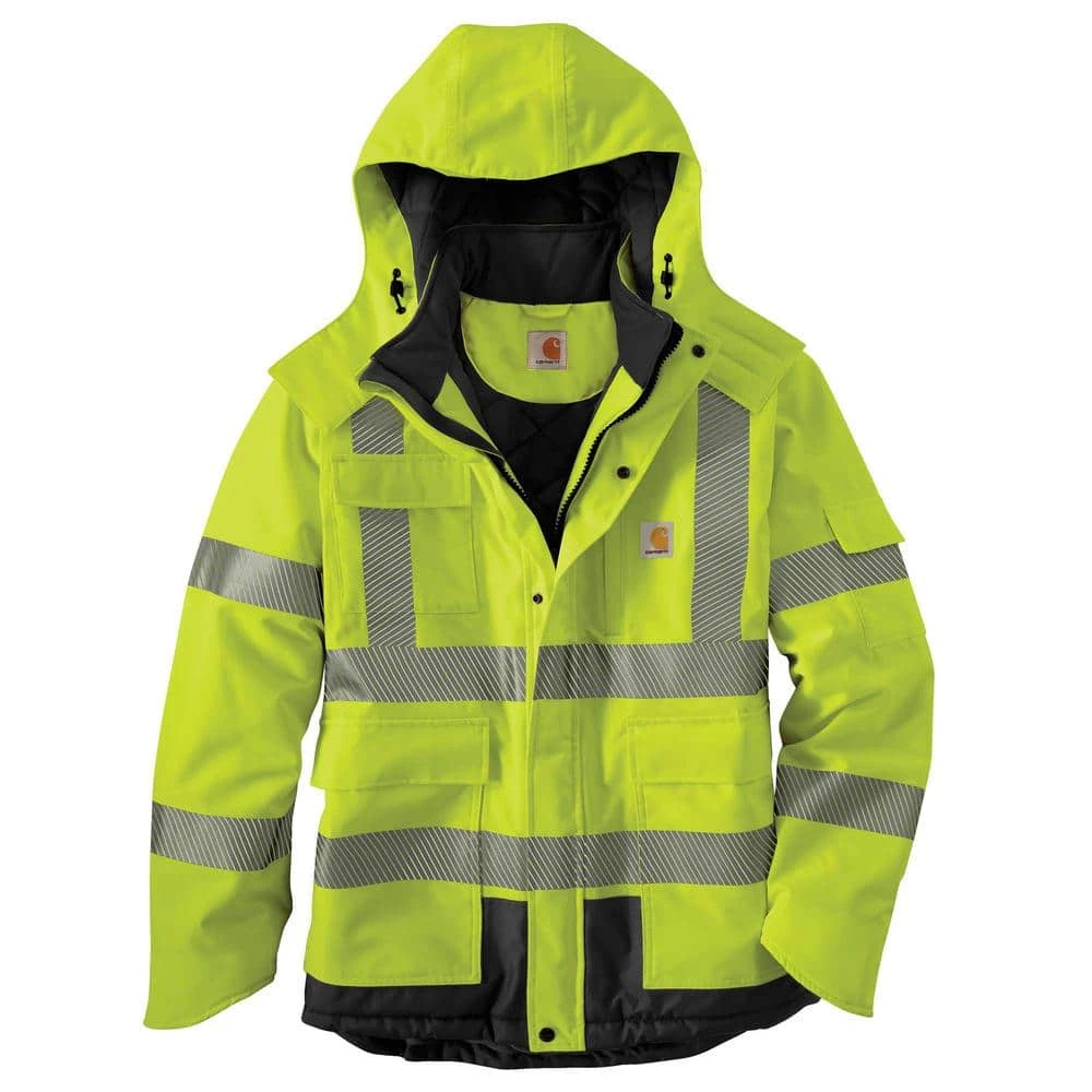 Made of 250-denier, 100% polyester with Rain Defender water-repellent and waterproof membrane, this jacket has a brushed polyester mesh lining. 250-denier, 100% polyester shell. Waterproof membrane and Rain Defender durable water-repellent. Brushed polyester quilt lining. Fully taped waterproof seams. Snap-on quilt lined hood with drawcord closure and barrel-lock adjusters. 2-front utility bands at shoulder level. Right-chest pocket with flap and hook-and-loop closure. Left-chest map pocket with waterproof zipper closure. Left sleeve pocket with flap and hook-and-loop closure. 2-lower front double pockets with top entry and side hand warmer entry. Sleeves include ergonomic openings with stretch-polyester storm cuffs and hook-and-loop adjustment. Back length: Large Regular: 30.75 in. ANSI Class-3, Type R visibility standards 3M Scotchlite Reflective Material segmented trim number 5510 maintains performance through 75-home launderings. Meets ANSI/ISEA 107.