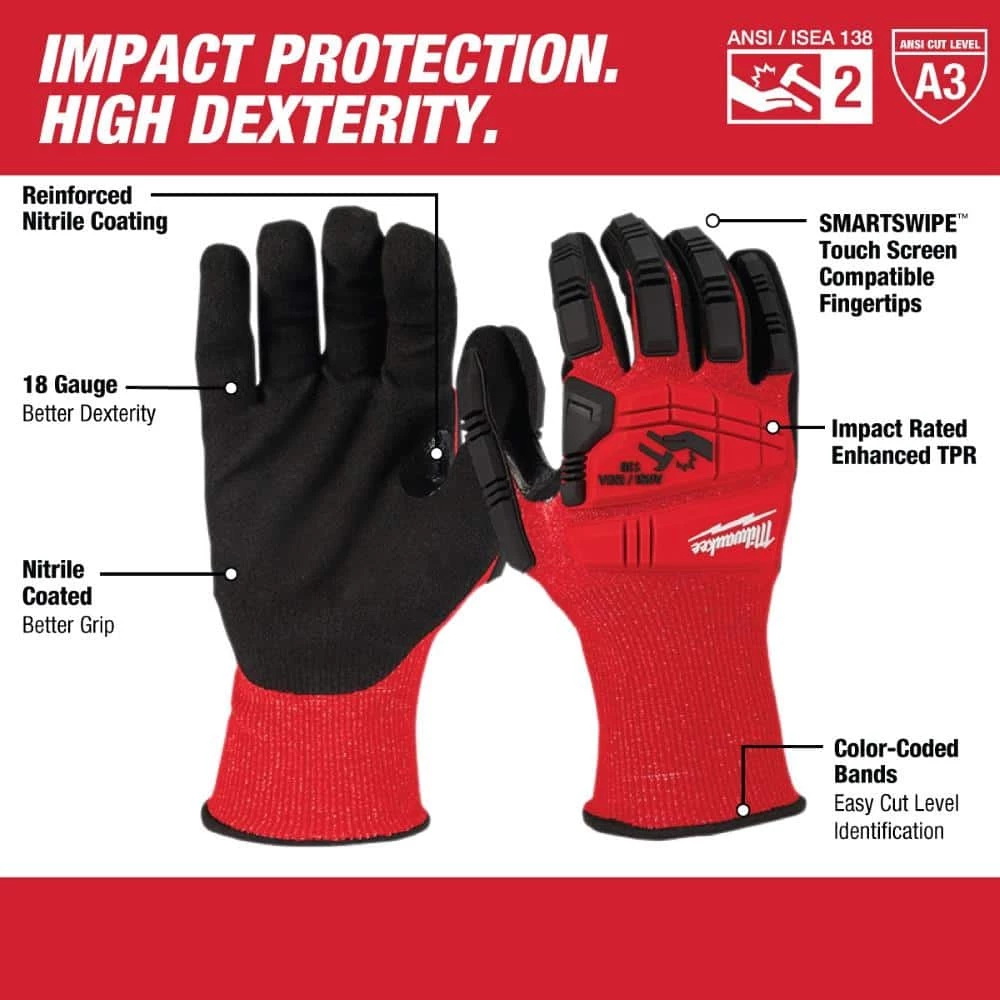 The MILWAUKEE® Impact Cut Level 3 Nitrile Dipped Gloves offer impact protection with high dexterity. These cut resistant gloves utilize ANSI/ISEA Impact Level 2-rated enhanced TPR for back of hand protection. The gloves also feature a reinforced nitrile coating between the thumb and index finger for enhanced durability in high wear points. Constructed with an 18-gauge knit, these gloves maintain high dexterity fingertips when handling small objects. SMARTSWIPE™ touchscreen-compatible fingertips provide you with full access to your touchscreen devices without removing the gloves. MILWAUKEE® Dipped Gloves feature a color-coded wrist band and back of hand logo for easy cut level identification.