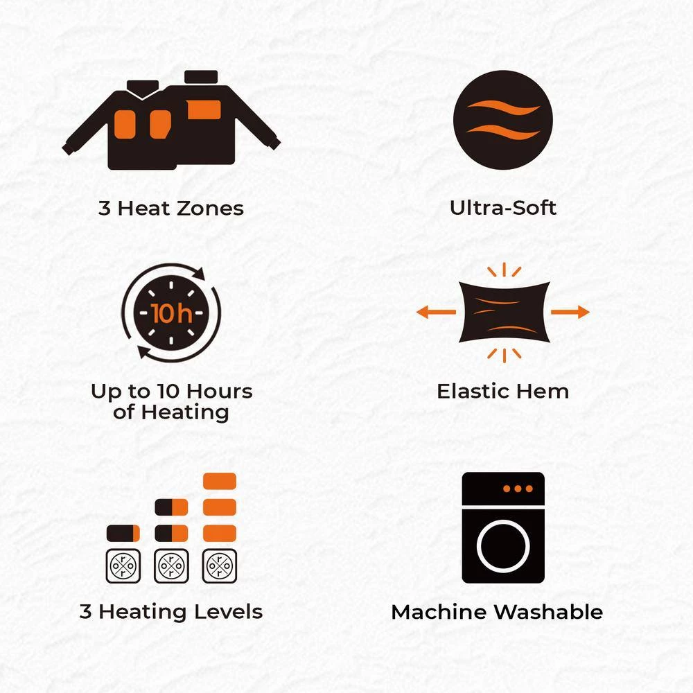 - Three carbon fiber heating elements generate heat across core body areas (left and right chest, mid back)
