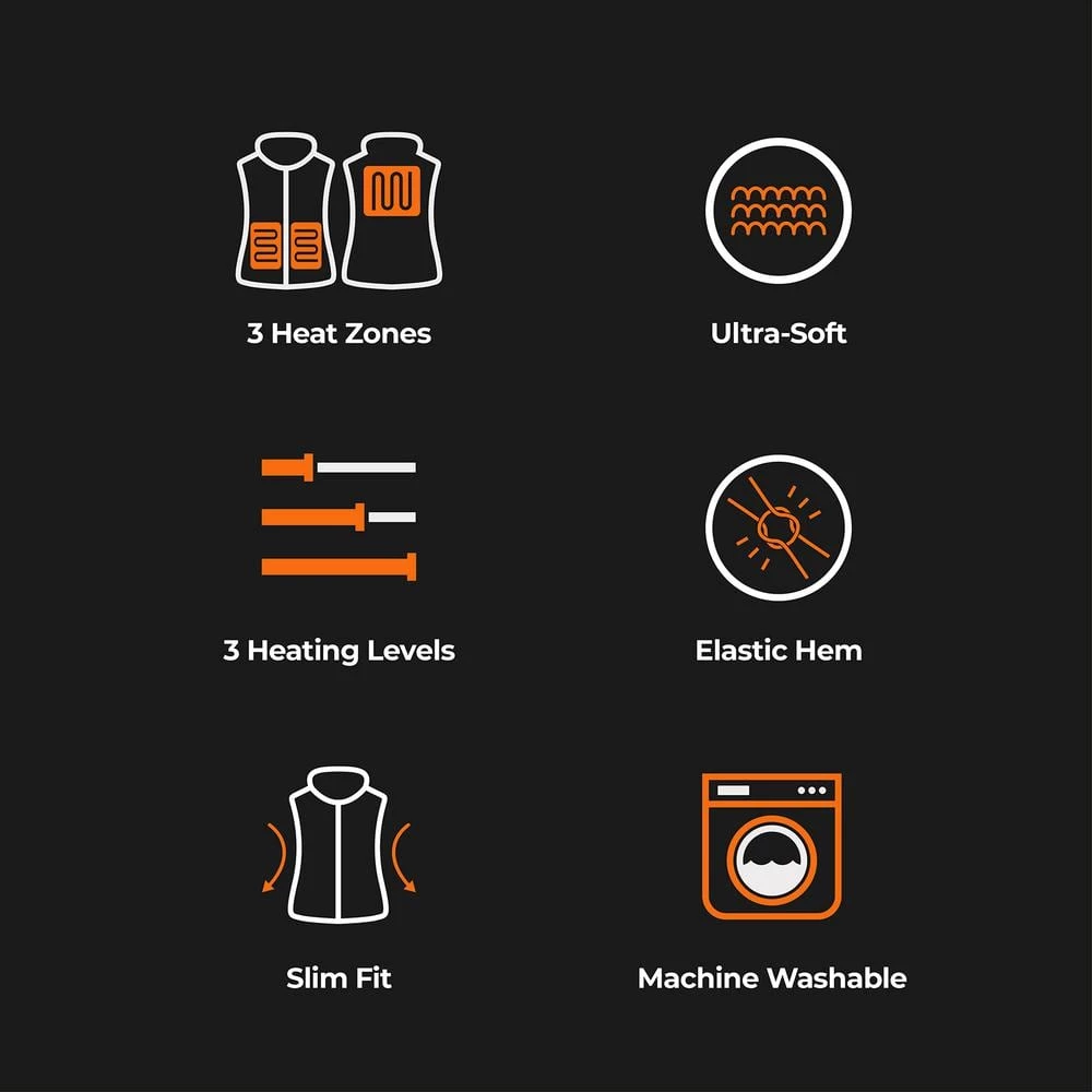 - Includes: 1x heated vest, 1x battery, 1x universal charger kit, 1x type-C cable, 1x user manual, 1x portable bag
